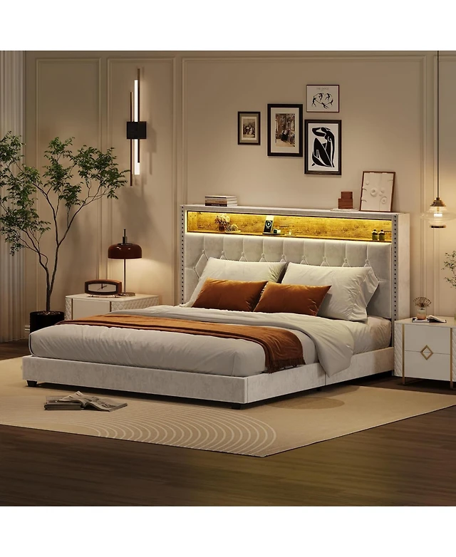 gaomon Upholstered Bed Frame with Headboard and Led Lights, Charging Station