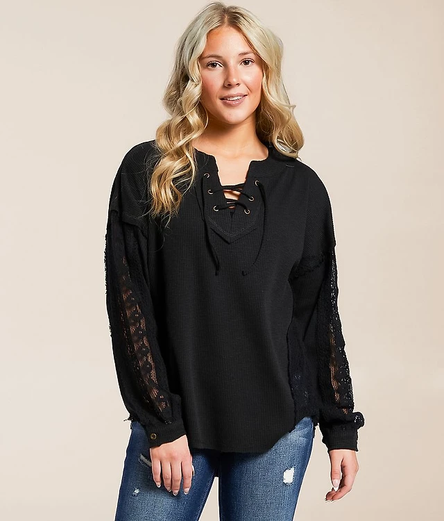 Just Polly Juniors' Lace-Trim Sweetheart-Neck Knit Top