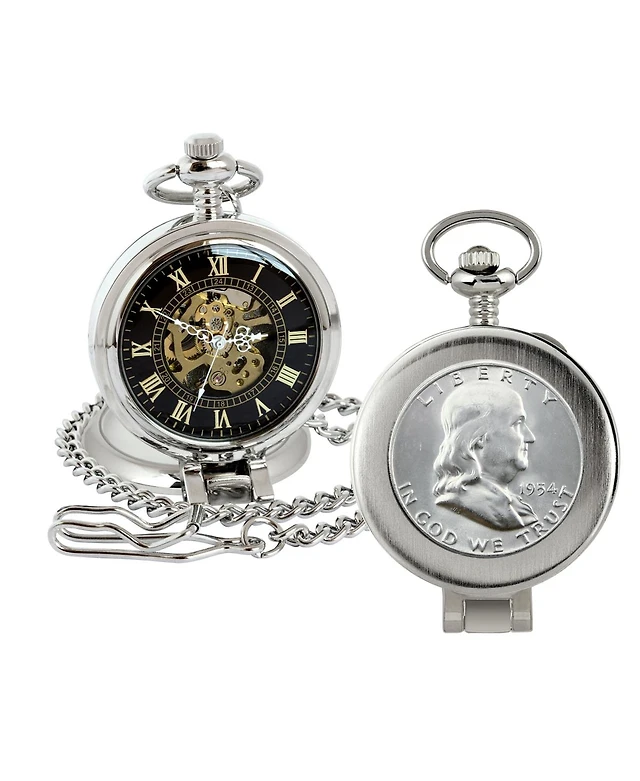 American Coin Treasures 16277 Gold-Layered Silver Franklin Half Dollar Coin Pocket Watch with Skeleton Movement, Black Dial with Gold Roman Numerals