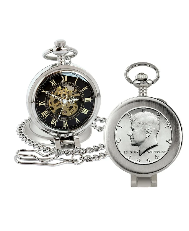 American Coin Treasures 16265 Jfk Half Dollar Coin Pocket Watch with Skeleton Movement, Black Dial with Gold Roman Numerals - Magnifying Glass