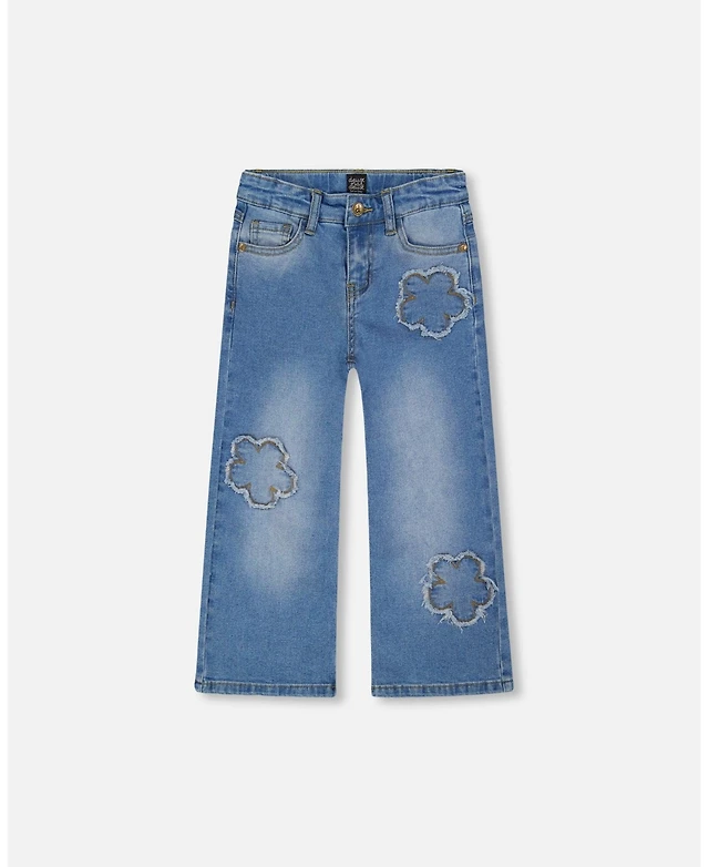 Deux par Girl Wide Leg Stretch Light Blue Denim Jeans with Flower Stitching - Child