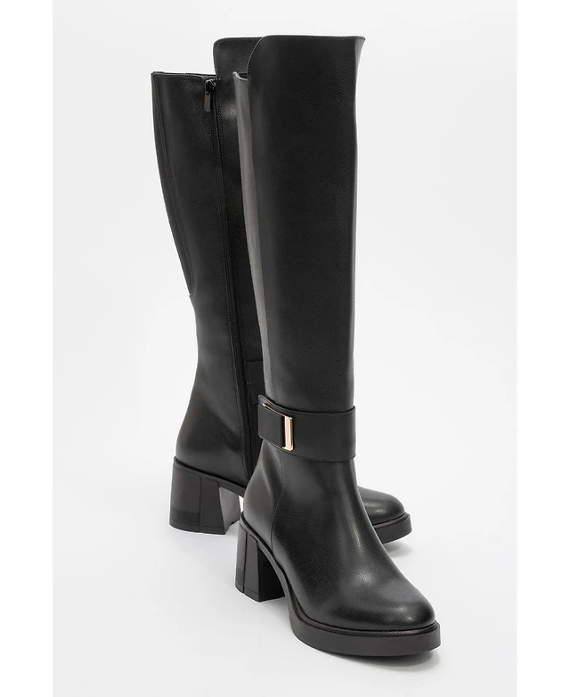 Journee Women's Avalonn Buckle Strap Knee High Stacked Heel Inside Zipper Extra Wide-Calf Comfort Dress Boots