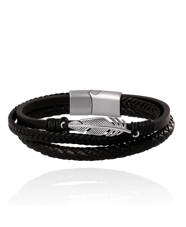 Lucky Brand Mens Triple Row Black Leather Bracelet with Silver Accents