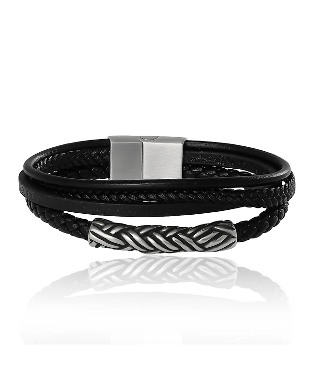 Lucky Brand Men s Multi Row 8'' Leather Bracelet with Braided Barrel, Black