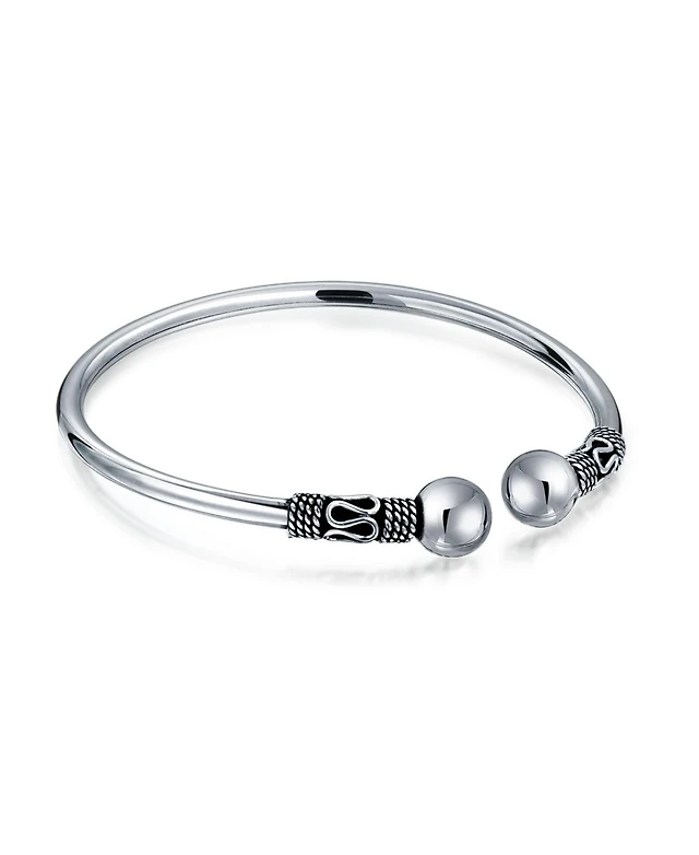 Bling Jewelry Boho Balinese Bali Style Scroll Ball Tips Bypass Stacking Black Bangle Cuff Bracelet Oxidized Sterling Silver