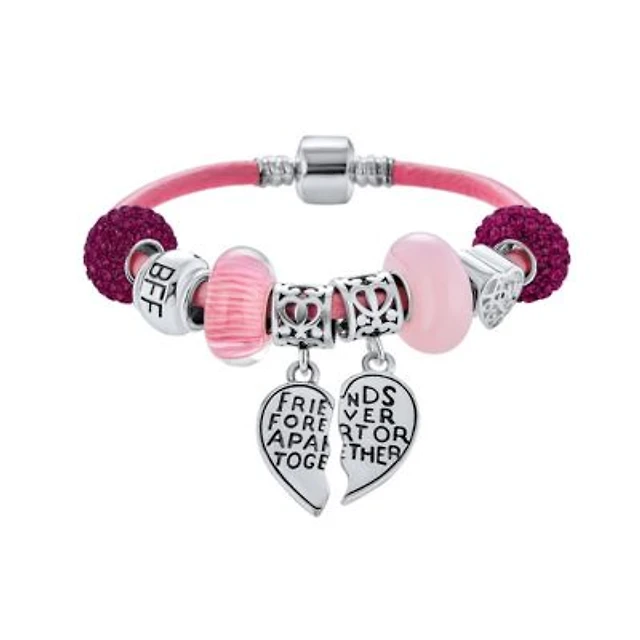 Bling Jewelry 2 Piece Bead Best Friend Sorority Sister Bff Split Heart Theme Multi Charm Bracelet Pink Leather For Women .925 Sterling Silver European Barrel Clasp 8 Inch