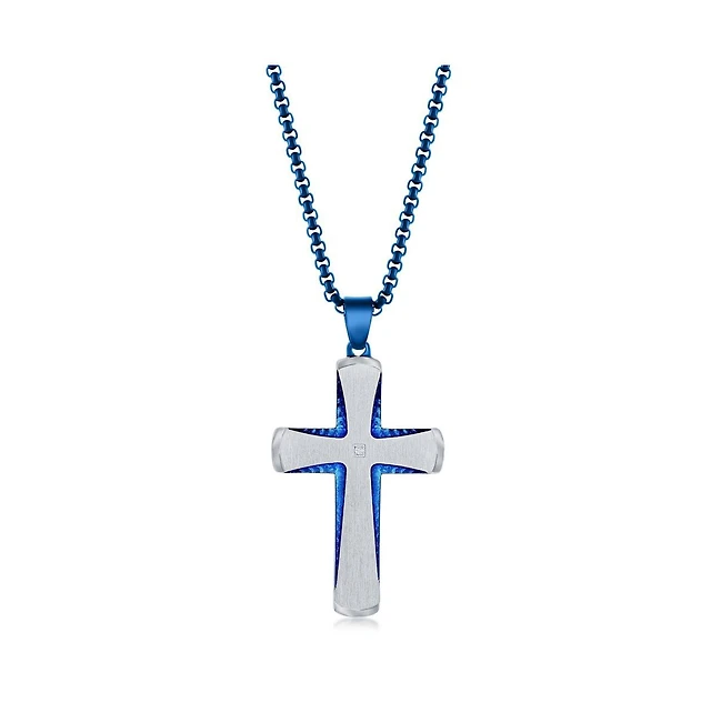Men's Stainless Steel Silver & Blue Plated Single Cz Cross Necklace