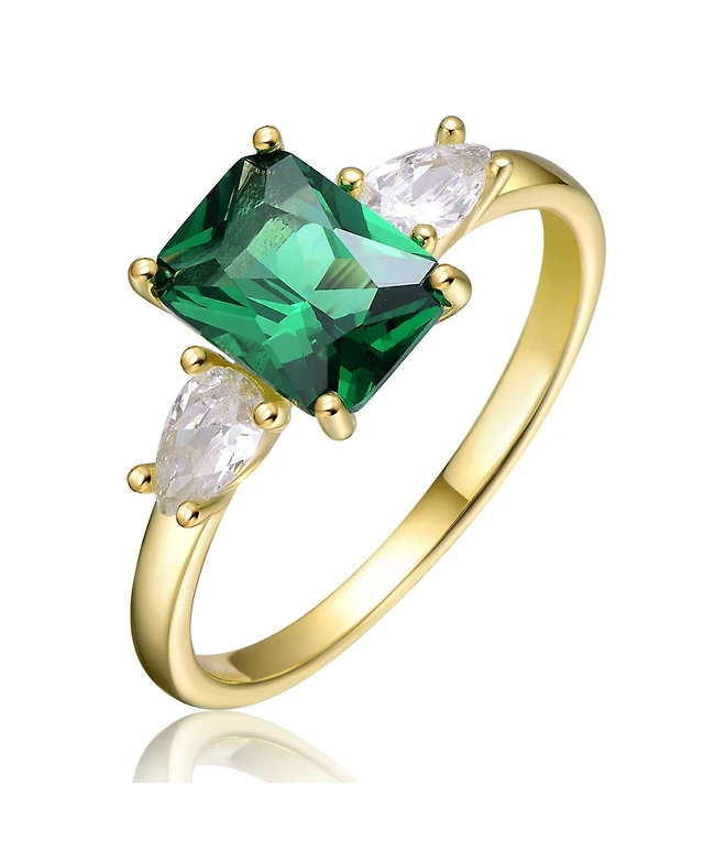 Sterling Silver 14k Yellow Gold Plated with Green & Cubic Zirconia 3-Stone Statement Ring