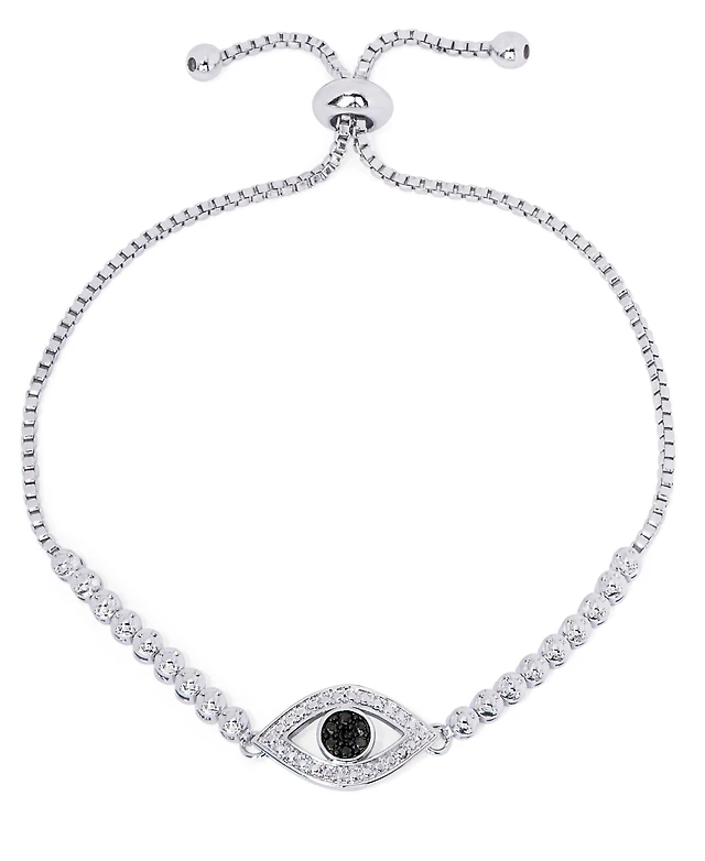 Black Diamond Accent Evil Eye Adjustable Bolo Bracelet in Silver Plate