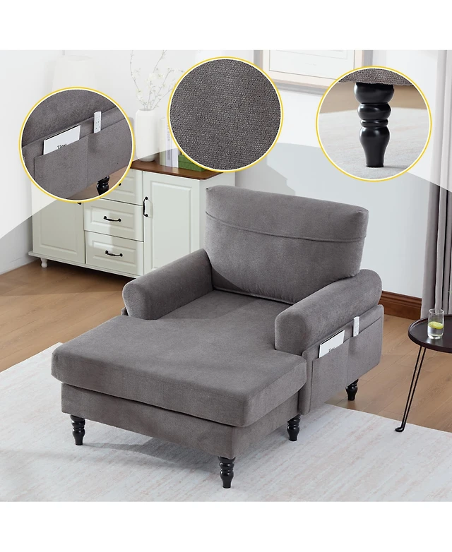 Rainsken Comfortable Chenille Chaise Lounge Chair, Oversized Leisure Recliner Single Sofa with Wood Legs and Side Storage Pockets for Home Use