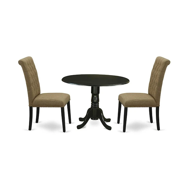 East West Furniture 3 Piece Dinette Set Contains 1 Drop Leaves Modern Dining Table and 2 Black Wooden Dining Chairs with Slatted Back