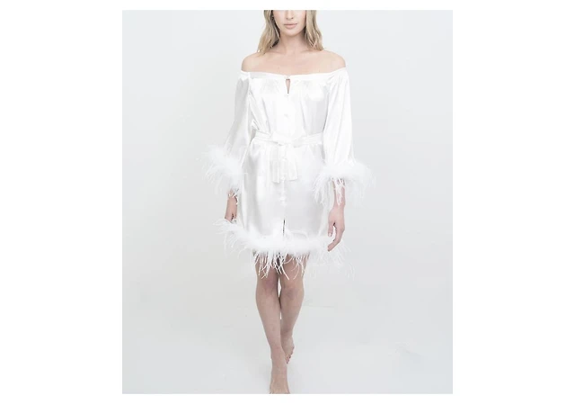 Le Laurier Bridal Women's Off-The-Shoulder Hair and Makeup Robe Feather Trim On The Sleeve Hem