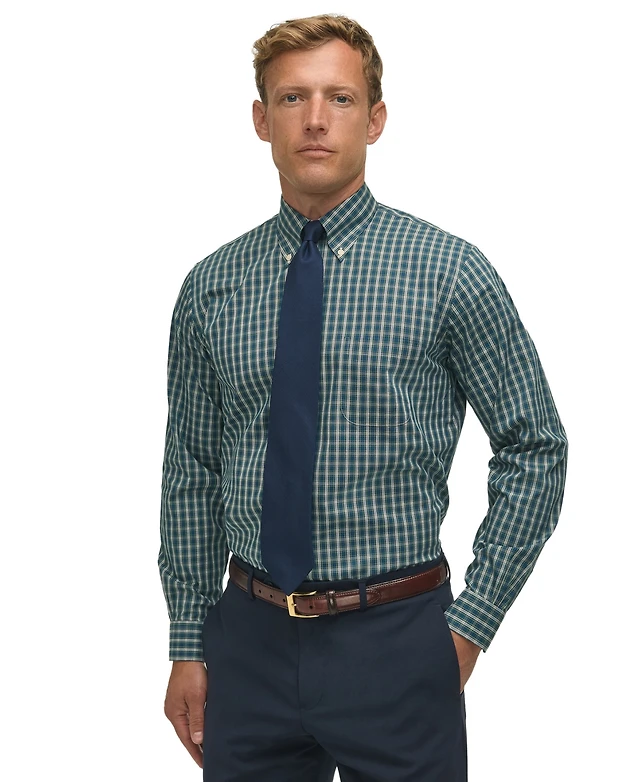 Men's Regular Fit Non-Iron Polo Button-Down Collar Blue Check Pinpoint Dress Shirt