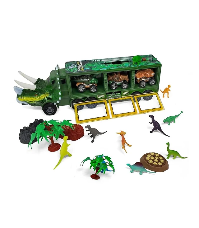Kovot Dino Transport Truck Play set: 14" Long with Light & Music, 3 Cars, 27 Mini Dinosaurs, Props, Car Launcher, and Ramp