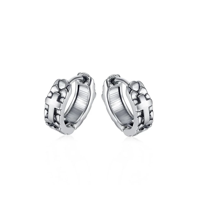 Stainless Steel Oxidized Pebbled Cross Huggie Hoop Earrings