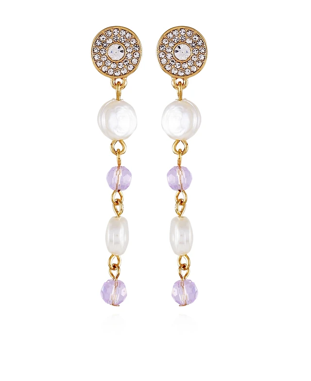 T Tahari Gold-Tone Lilac Violet Glass Stone and Imitation Pearl Long Drop Earrings