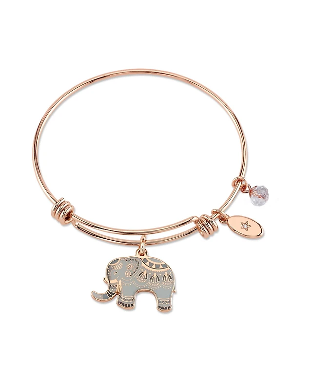 Unwritten "All Good Things are Wild and Free" Elephant Charm Adjustable Bangle Bracelet in Rose Gold-Tone Stainless Steel with Silver Plated Charms