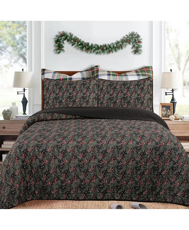 MarCielo 3 Pcs Festive Christmas Quilt Bedspread Set Holiday Bedding Holly Berry Tree King