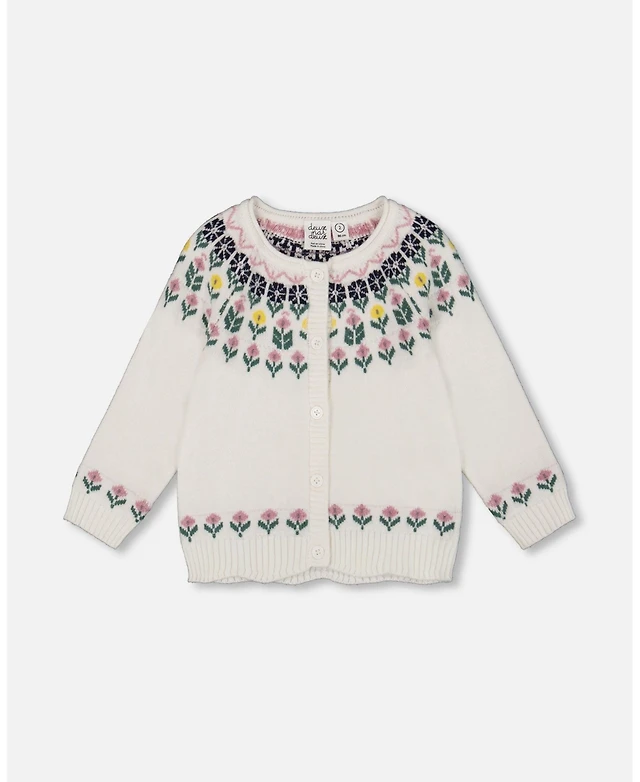 Deux par Baby Girl Jacquard Knit Cardigan Off-White with Floral Pattern
