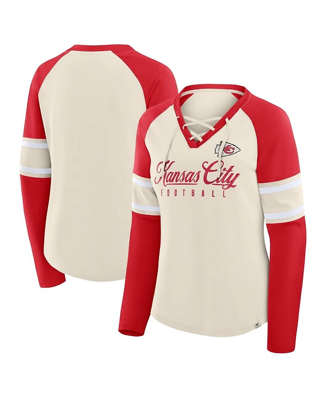 Women's Majestic Threads Patrick Mahomes Red Kansas City Chiefs Name and Number Off-Shoulder Script Cropped Long Sleeve V-Neck T-shirt