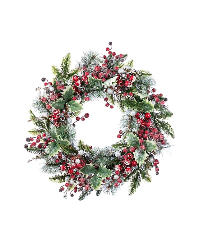 National Tree Company 24" Wintry Pine Wreath with Cones, Red Berries, Snowflakes and 50 Clear Lights
