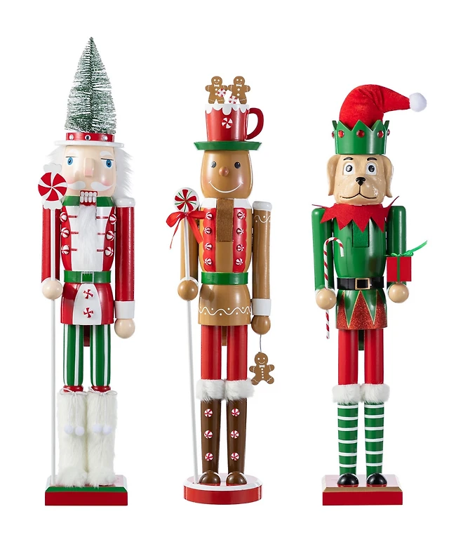 Glitzhome Wooden Christmas Green Brush Tree, Gingerbread Man and Elf Dog Nutcracker, Set of 3