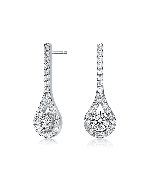 Sterling Silver with Rhodium Plated Clear Pear and Round Cubic Zirconia Halo with Open Pear Drop Earrings