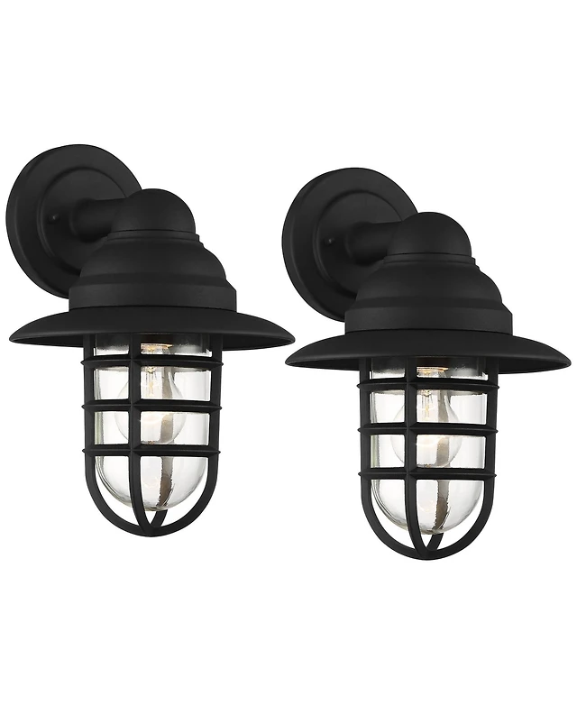 Oberlin Rustic Industrial Farmhouse Outdoor Barn Light Fixtures Set of 2 Black Dusk to Dawn Motion Sensor 9" Clear Seedy Glass for Exterior Deck