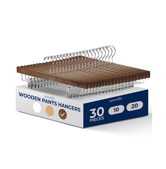 SereneLife 30 Pcs. Premium Wooden Pants Hangers - Heavy Duty Hanger Set with Chrome 360° Swivel Hook (Retro)