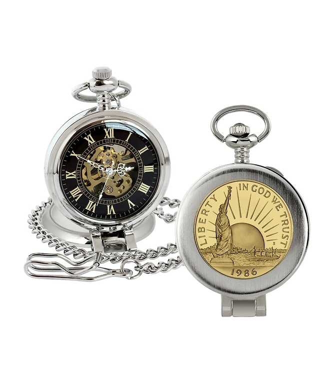 American Coin Treasures 16280 Gold-Layered Statue of Liberty Commemorative Half Dollar Coin Pocket Watch with Skeleton Movement, Black Dial with Gold