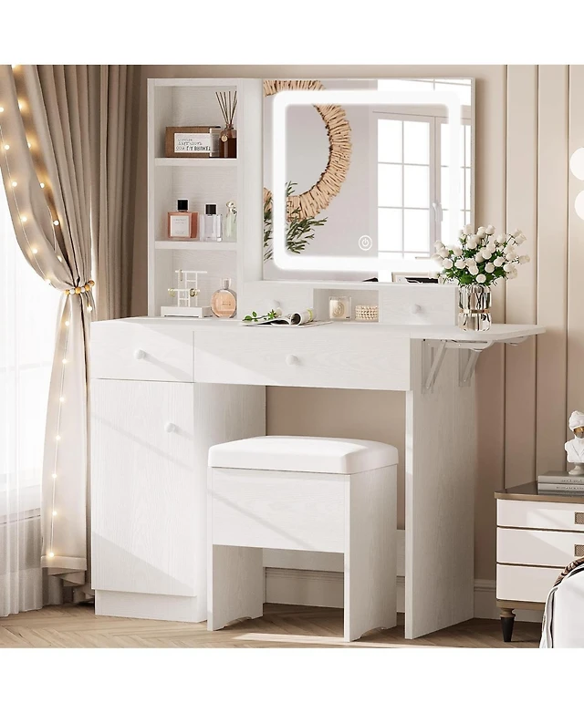 Vanity Desk with Led Lighted Mirror & Power Outlet & Cabinet