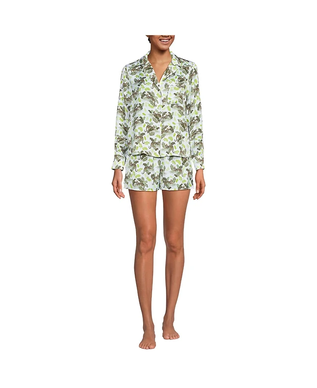 Lands' End Women's Matte Satin 2 Piece Pajama Set - Long Sleeve Top and Shorts