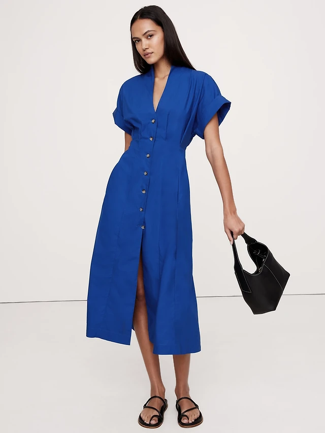 Stretch-Cotton Poplin Pintuck Long-Midi Shirt Dress