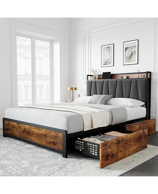 Gaomon Bed Frame With A Functional Storage Headboard Industrial Full Platform Bed With 2 Large Drawers Plus A Charging Station