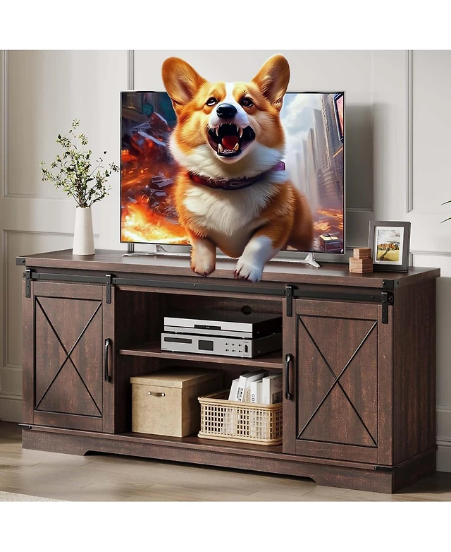 Tv stand with two doors and three drawers, multi-purpose media console, black wood entertainment center