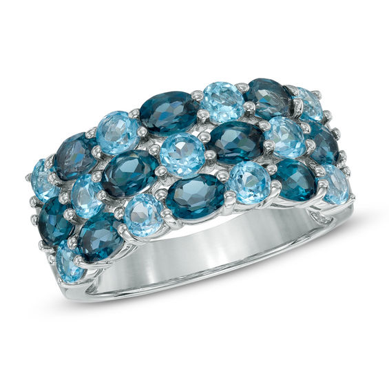 Oval and Round Blue Topaz Three Row Ring in Sterling Silver