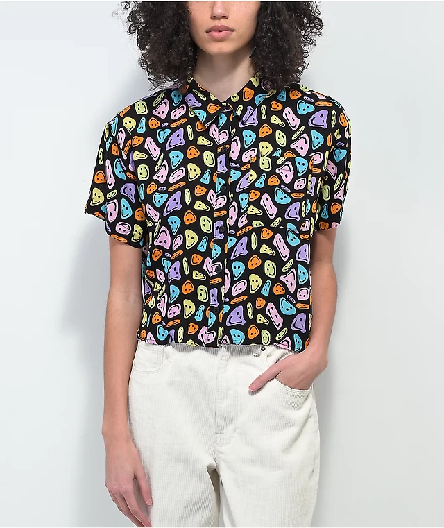 A-Lab Kona Warped Smile Black Short Sleeve Button Up Crop Shirt