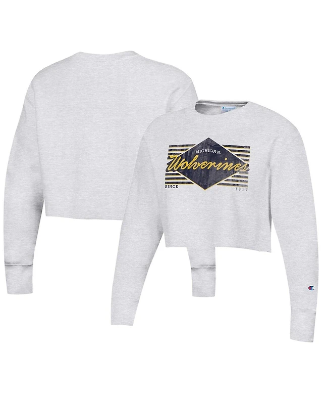Women's Champion Heather Gray Distressed Michigan Wolverines Reverse Weave Cropped Pullover Sweatshirt