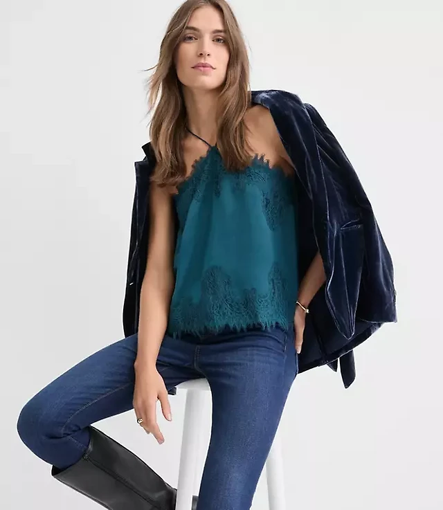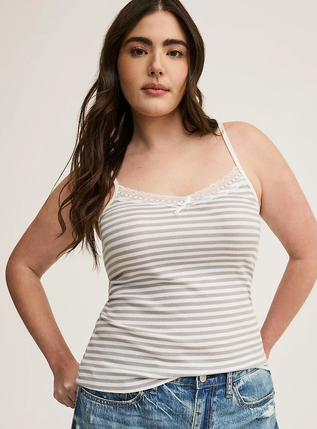 Ribbed Shine Fitted V-Neck Lace Trim Cami