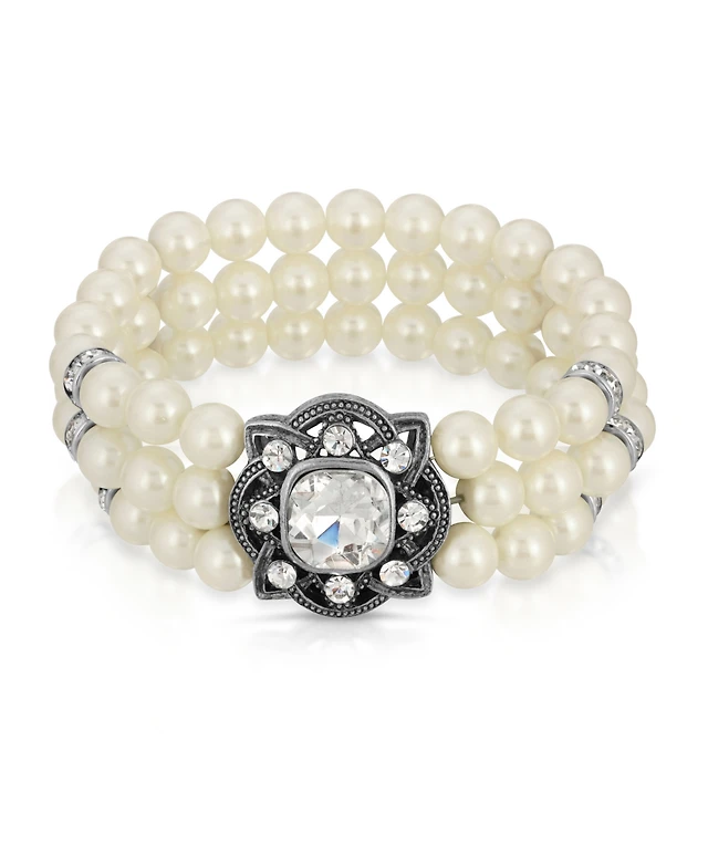 2028 Silver-ToneTone 3-Row Imitation Pearl and Crystal Strectch Bracelet