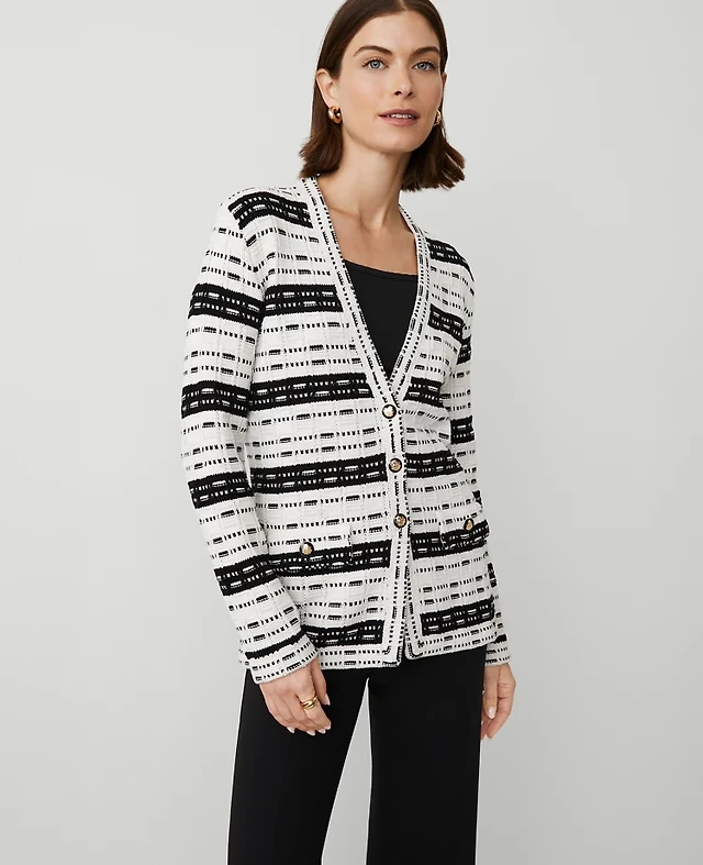 Ann Taylor Striped Tweed Sweater Jacket White/Black Multi Women's
