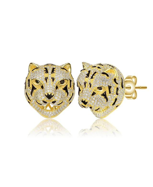 14K Gold Plated with Clear Cubic Zirconia 3-Stone Stud Earrings