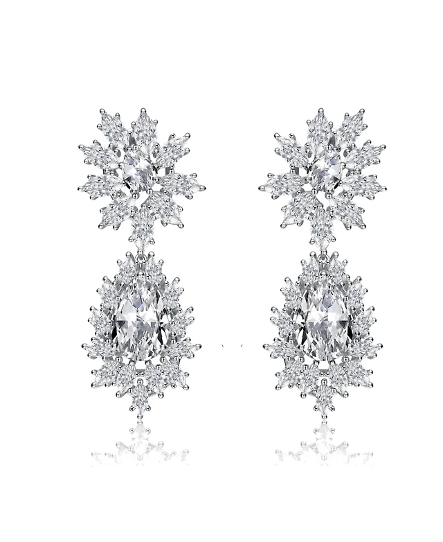 White Gold Plated with Cubic Zirconia Hibiscus Flower Cluster Drop Earrings with Leverback