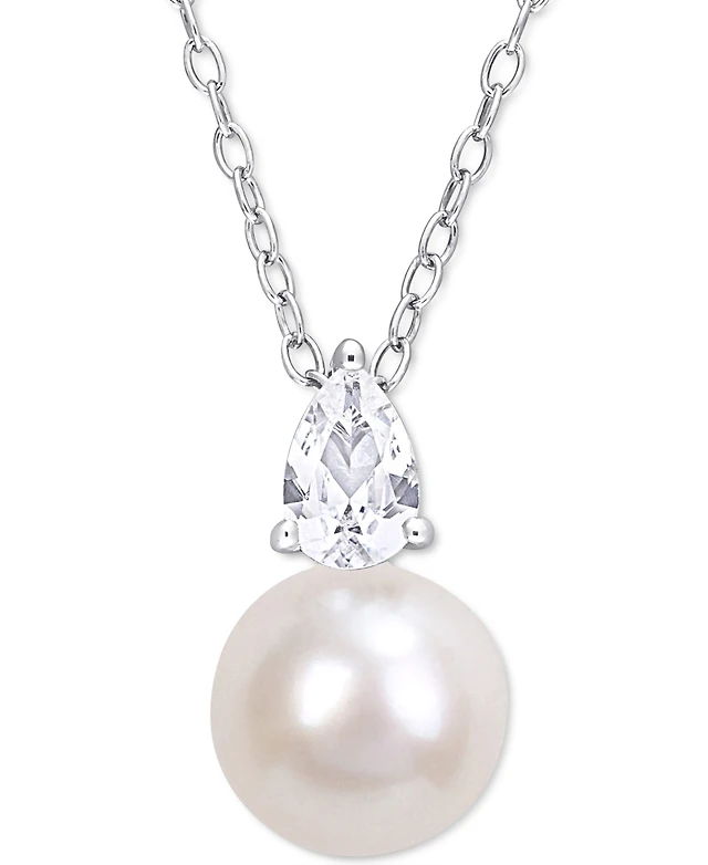 2-Pc. Set Cultured Freshwater Pearl (7-1/2 & 8-1/2mm) Cubic Zirconia Pendant Necklace Matching Stud Earrings Sterling Silver