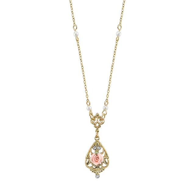 2028 Gold-Tone Crystal and Pink Porcelain Rose Simulated Pearl Necklace 17"