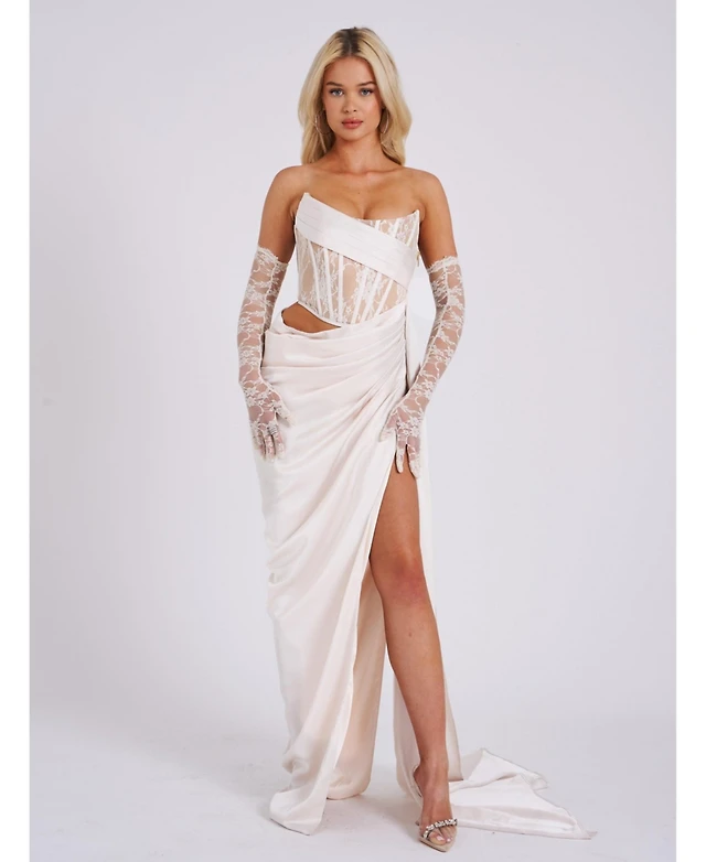 Miss Circle Women Callie Pearl White Lace Satin Corset High Slit Gown