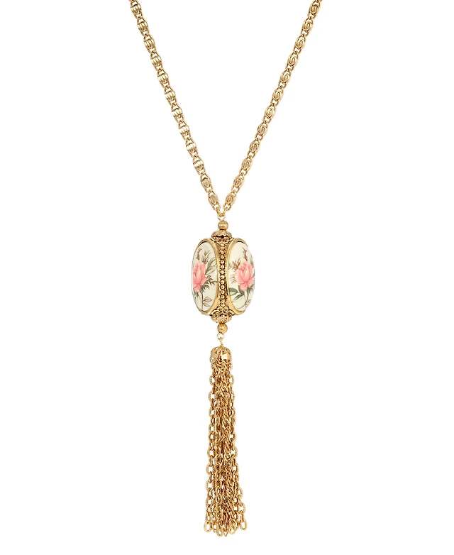 2028 Gold-Tone 3 Sided Pink Flower Spinner Tassel Necklace