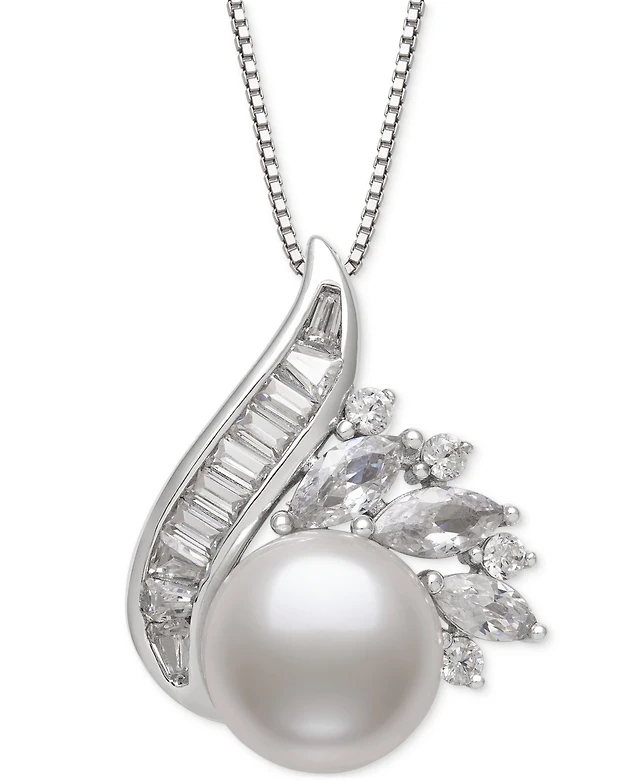 2-Pc. Set Cultured Freshwater Pearl (7-1/2 & 8-1/2mm) Cubic Zirconia Pendant Necklace Matching Stud Earrings Sterling Silver