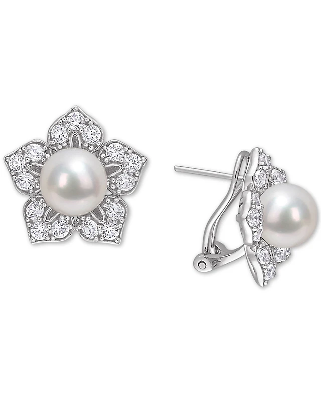 Cultured Freshwater Pearl (8-1/2mm) & Lab-Created White Sapphire (2-3/4 ct. t.w.) Flower Stud Earrings in Sterling Silver