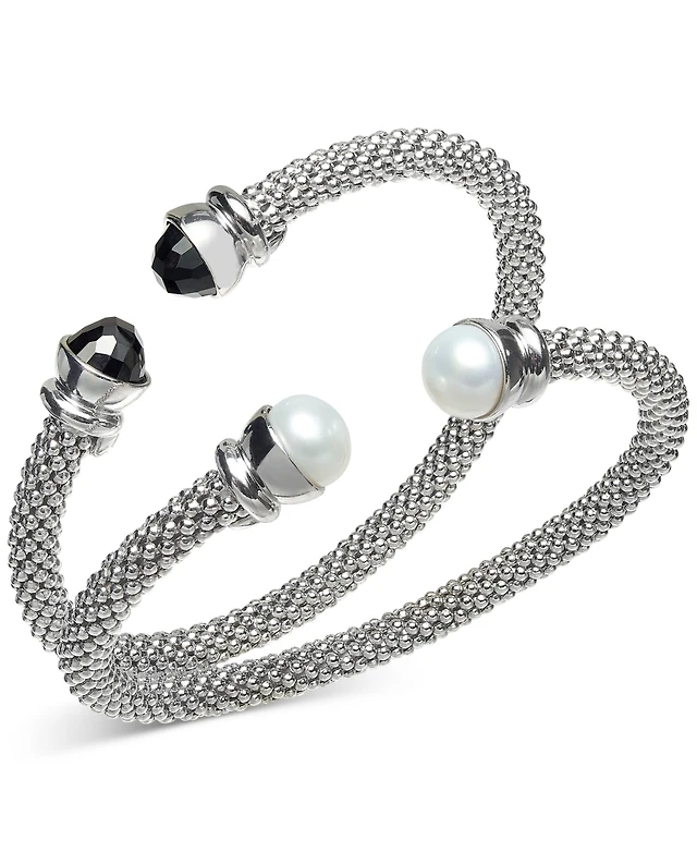 2-Pc. Set Cultured Freshwater Pearl (8 1/4 - 8 1/2mm) & Onyx Popcorn Cuff Bangle Bracelets in Sterling Silver